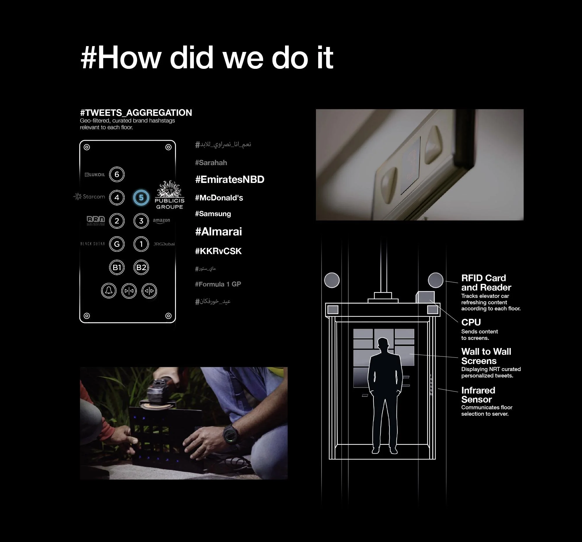 We turned an ordinary elevator ride into an unforgettable brand experience. Inside one of the busiest towers in Dubai Media City, home to the region’s top media agencies, we hijacked the elevator panel. Each floor button was relabeled with the name of an agency’s client brand. When pressed, instead of the usual floor indicator, the screen revealed live Twitter conversations and audience insights about that brand.